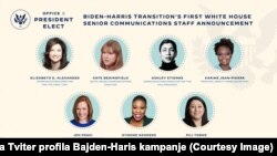„Sa ponosom predstavljam prvi tim viših zvaničnika za komunikacije Bijele kuće čiji su svi članovi žene. Kvalifikovani i iskusni komunikatori će različitim pristupima i podjelom odgovornosti doprinijeti izgradnji ove zemlje”, saopštio je Biden, istakavši da je riječ o prvom timu tog tipa koji čine isključivo ženski članovi.