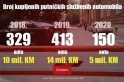 Institucije i javna preduzeća u Bosni i Hercegovini su 2020. godine, tokom krize uzrokovane pandemijom koronavirusa, potrošile gotovo pet miliona maraka za kupovinu 150 službenih putničkih vozila, pokazuju podaci Baze službenih automobila.