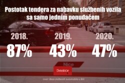 U većini slučajeva institucije su nabavljale nova vozila. Tokom 2020. godine, od 366 objavljenih tendera njih 30 posto ili ukupno 109 je objavljeno zbog potražnje polovnih vozila.