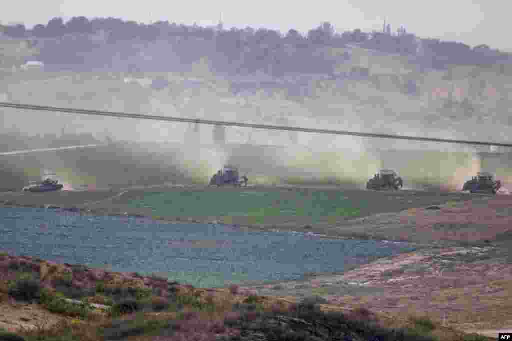 A picture taken from southern Israel along the border with the Gaza Strip shows Israeli army buldozers crossing the border into Gaza, on October 29, 2023 amid ongoing battles between Israel and the Palestinian militant group Hamas. Photo by Menahem KAHAN