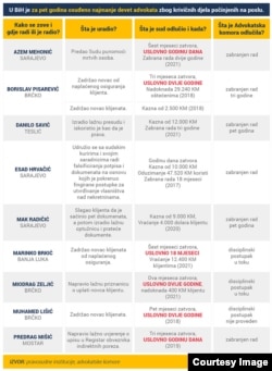 Šestorici su sudovi ili advokatske komore zabranili rad na određeno vrijeme, dok u slučaju ostale trojice disciplinski postupak nije okončan ili nije ni vođen.